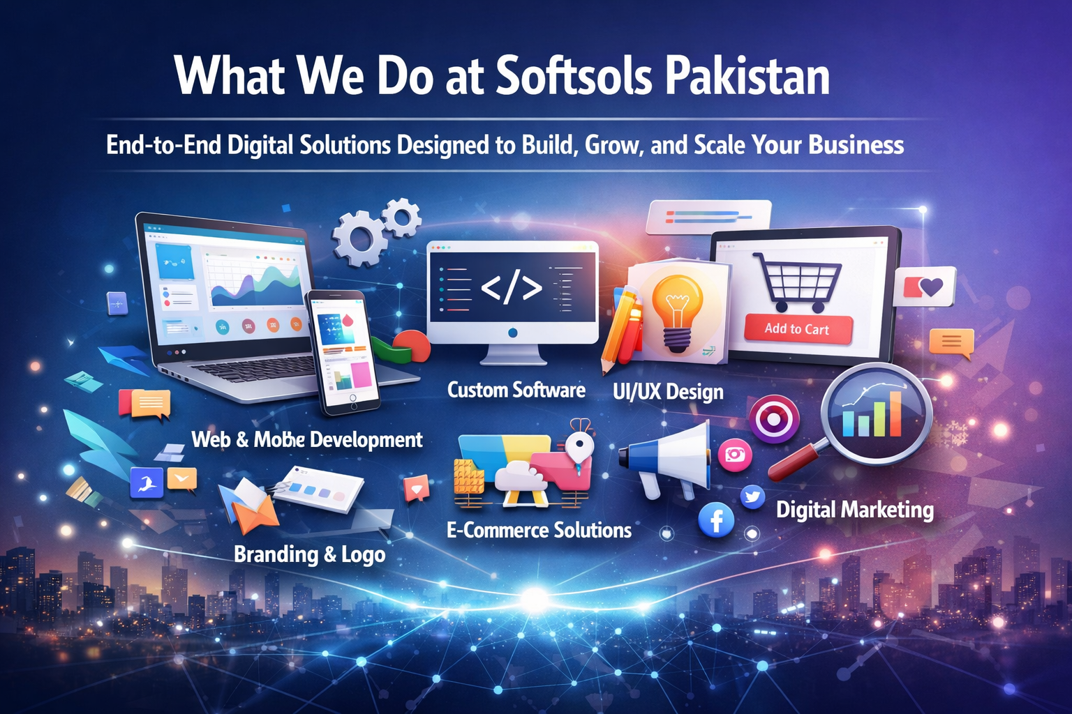 Softsols Pakistan is a full-service digital solutions company that helps businesses grow through innovative technology and design. We specialize in web and mobile application development, custom software solutions, UI/UX design, branding and logo creation, e-commerce development, and digital marketing. From concept to deployment, we provide end-to-end services including product design, development, testing, and ongoing support—ensuring scalable, user-focused, and result-driven solutions for clients worldwide.